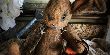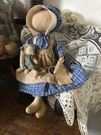 This is hand stitched. It has been hand painted, has resin eyes, embroidered nose and mouth. Has a homespun scarf. Ears are poseable. Stands 18 inches tall.