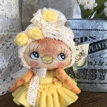 Hand painted face, soft vintage chenille hat with roses. Soft fabric body and wings. Little ruffled skirt. 10 inches tall. Weighted bottom.