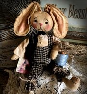 This is hand stitched. It has been hand painted, has resin eyes, embroidered nose and mouth. Has a homespun scarf. Ears are poseable. Stands 18 inches tall.